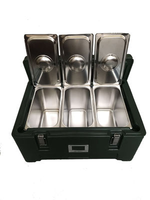 Hoogste de aanbiedings onovertroffen gemak van Ladingspan carriers, lading snel te houden, te vervoeren en, voor de snelle verrichtingen van de voedseldienst te dienen. De cfc-vrije schuimisolatie beschermt veilige voedseltemperaturen voor 4+-uren zonder elektriciteit, die de hete koude van het voedsel hete en koude voedsel houden. Dit maakt tot het een ideale keus aan openluchtgebeurtenissen en catering, met een luchtdicht, verwijderbaar pakking en een afwasmachine-brandkast ontwerp voor hygiënische, arbeidsbesparende schoonmaakbeurt. Verwijder gemakkelijk de pannen van GN 1/1 met de ingebouwde vingerinkepingen, knoeit het verminderen. De naadloze, uit één stuk bouwstijl maakt deze dragerdeuk, barst, en breekt bestand voor de duurzame dienst af, terwijl de brede nylon klinken rust-proof toegang tot inhoud aanbieden. Vormen-in handvatten aan alle vier kanten verzeker het comfortabele dragen, met dragers die veilig stapelen. Pan Carriers is een grote keus voor cateringsverrichtingen kijkend om hun hete en gekoelde maaltijd te verzekeren!