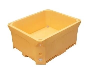 Deze containers zijn voorzien van een deksel dat van bovenaf kan worden geopend voor gemakkelijke toegang en een rubberen handgreep voor veilig hanteren. Het ontwerp omvat wielen in palletstijl aan de onderkant, waardoor soepele mobiliteit mogelijk is, zelfs wanneer ze volledig beladen zijn. De heldergele kleur verbetert de zichtbaarheid, wat vooral handig is in drukke magazijn- of bezorgomgevingen.